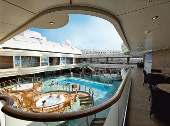 Suite s balkónom/panoramatickým oknom: cca32m²(Royal suite: 52m², Family suite: 45-53m², Deluxe Suite: 32-39m², Aurea suite: 21-47m²), kajuta s manželskou posteľou (na požiadanie 2 oddelené postele) a rozkladacia pohovka. Klimatizácia, kúpeľňa s vaňou, toaletný stolík, priestorná skriňa, interaktívna TV, telefón, minibar, sejf, sušič na vlasy. Balkón so stolíkom a stoličkami/panoramatickým oknom. Internetové pripojenie (za poplatok).