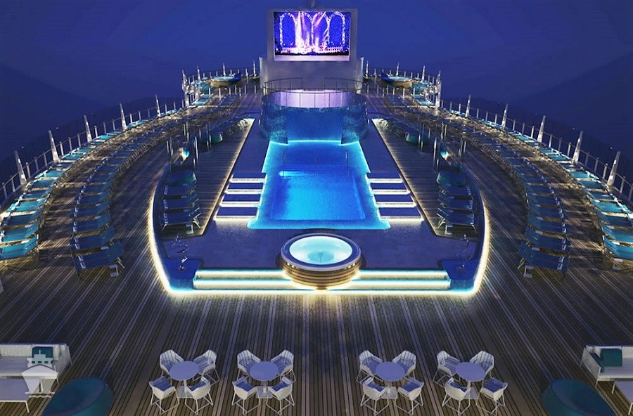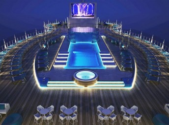 "South Beach Pool" – s jedinečným umiestnením na korme 7. paluby, kde sa budete cítiť naozaj ako na pláži. 2 panoramatické výťahy ho spájajú s najvyššími palubami.