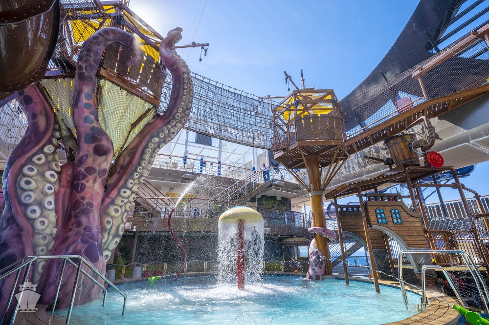 Bazén Long Island Pool na 18. palube - s 360 stupňovým fontánovým ostrovom. Je prepojený s tematickým aquaparkom Pirates Cove.
